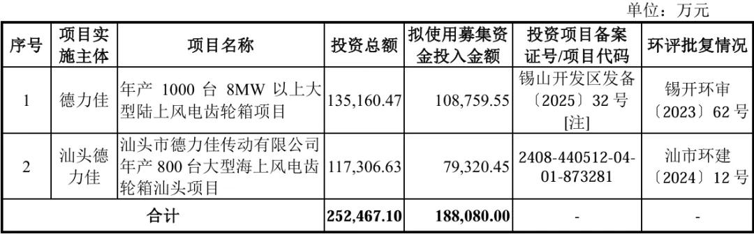 本此拟募资用途:项目总投资资金18.81亿,其中10.88用于年产1000台8MW以上大型陆上风电齿轮箱项目,7.93亿用于汕头市德力佳传动有限公司年产800台大型海上风电齿轮箱汕头项目,具体项目如下: