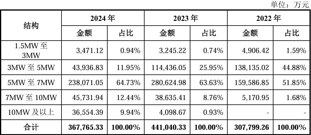 2024年,公司收入按产品功率可分为五大板块,分别为1.5MW至3MW(0.35亿元,占2024年主营收入的0.94%)、3MW至5MW(4.39亿元,占2024年主营收入11.95%)、5MW至7MW(23.81亿元,占2024年主营收入64.73%)、7MW至10MW(4.57 亿元,占2024年主营收入 12.44%)、10MW 及以上(3.66 亿元,占 2024年主营收入9.94%)。2022 年至 2024 年间,5MW 至 7MW 功率产品始终为公司的核心业务及主要收入来源,其收入占比稳定在 50%以上;同时,公司产品持续向高功率推进,7MW至10MW功率产品的收入占比由2022年的1.68%增至 2024 年的 12.44%。